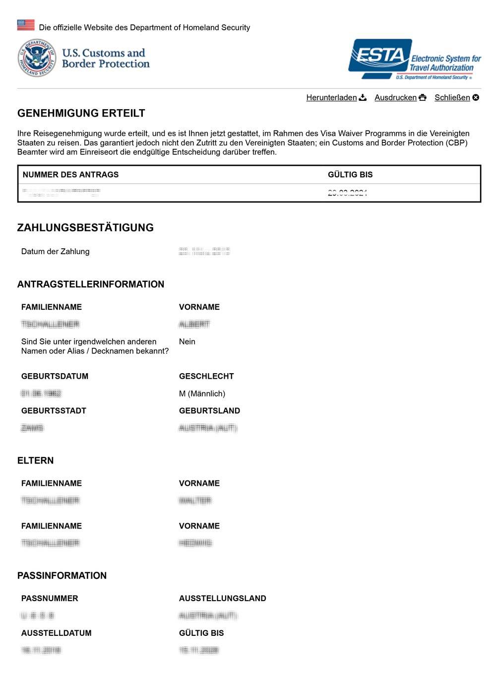 Bitte beachten Sie, dass Sie unbedingt für ALLE Personen (auch Babys!) die ESTA Registrierung für die Einreise in die USA mindestens 72 Stunden VOR der Einreise erledigen! Bitte drucken Sie das abgeschlossene Formular (ESTA-Genehmigung-Muster) mit der Genehmigungs-Nummer aus und legen Sie es zu den Reiseunterlagen. Manchmal wird die ESTA-Genehmigung beim Flug-Check-in, eher selten bei der Imigration, verlangt.